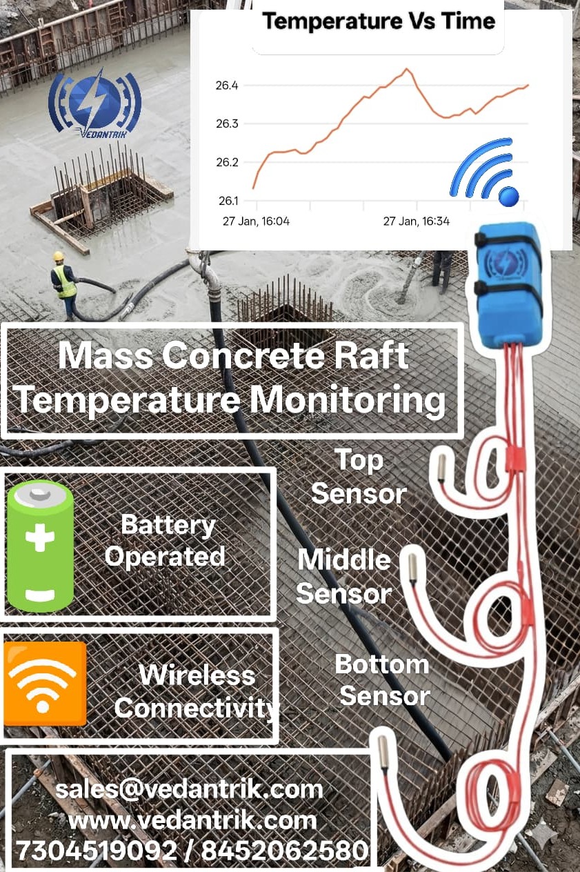 To prevent such issues, continuous monitoring of concrete temperature during curing is essential. Our Wireless Mass Concrete Temperature Monitoring System provides an efficient and reliable way to monitor the internal temperature of concrete in real time while also estimating in-situ concrete strength using the maturity method.