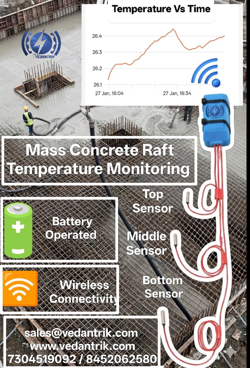 To prevent such issues, continuous monitoring of concrete temperature during curing is essential. Our Wireless Mass Concrete Temperature Monitoring System provides an efficient and reliable way to monitor the internal temperature of concrete in real time while also estimating in-situ concrete strength using the maturity method.