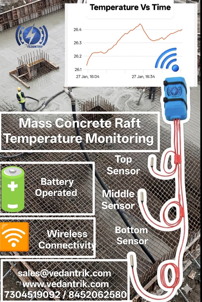 To prevent such issues, continuous monitoring of concrete temperature during curing is essential. Our Wireless Mass Concrete Temperature Monitoring System provides an efficient and reliable way to monitor the internal temperature of concrete in real time while also estimating in-situ concrete strength using the maturity method.