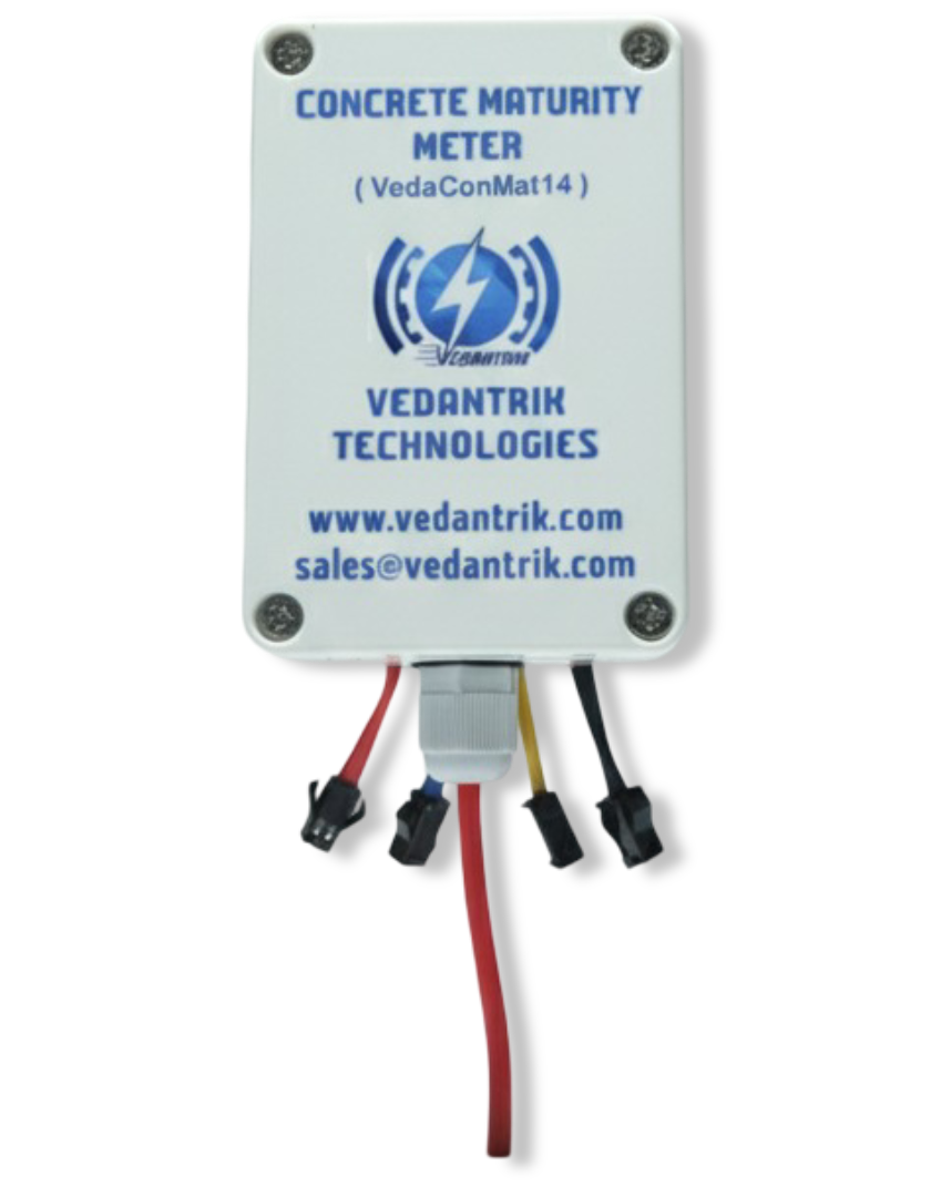 VedaConMat14 by Vedantrik Technologies is a device designed to accurately estimate the maturity of concrete using highly sensitive and precise temperature sensors. By measuring temperature variations within the concrete, the device calculates the maturity value, which is then correlated with strength to develop a reliable maturity index. This index is used to determine the in-situ compressive strength of concrete, enabling real-time monitoring of both precast and cast-in-place concrete.