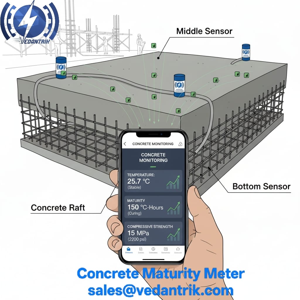 The temperature sensors are embedded into the concrete at the construction site to measure temperature continuously. The maturity value is then calculated based on the recorded temperature data and correlated with the concrete strength. This correlation must be established for the specific concrete mix design As per ASTM C1074 standards and remains valid as long as the mix design does not change.